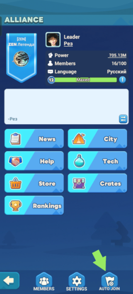 Скриншот экрана альянса со стрелочкой на кнопку автоприсоединения.