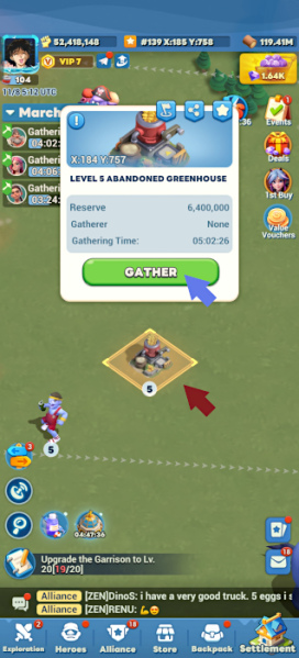 Найденное месторождение (красная стрелка) и кнопка сбора (синяя стрелка).